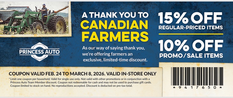 Princess Auto - "As a member of the Agricultural Producers Association of Saskatchewan (APAS), we are excited to pass along a special "Thank You" from our partners at the Canadian Federation of Agriculture (CFA) and Princess Auto Ltd. Princess Auto is offering an exclusive discount period to help producers gear up for the upcoming busy season. Since APAS is a member of the CFA, this offer is available to all your ratepayers".